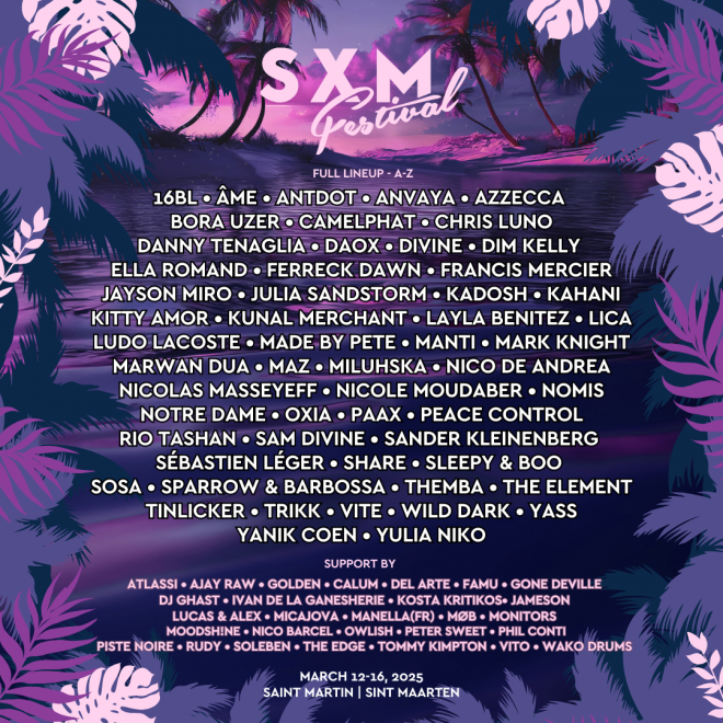 NEWS Tropical music and art getaway SXM festival returns to Saint Martin for 8th edition in 2025 Âme, Camelphat, Antdot, Bora Uzer, Chris Luno, Francis Mercier, Layla Benitez, Maz, Nicole Moudaber, Notre Dame, Sam Divine, Sander Kleinenberg, Sébastien Léger, Sosa, Sparrow & Barbossa, Themba, Trikk, Yulia Niko and many more announced.